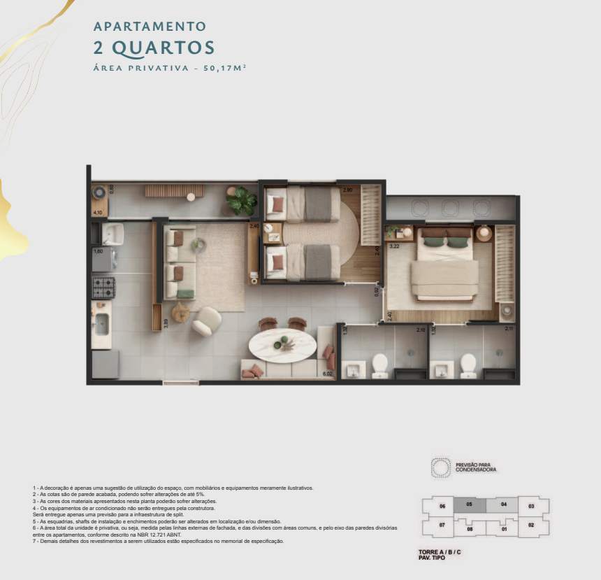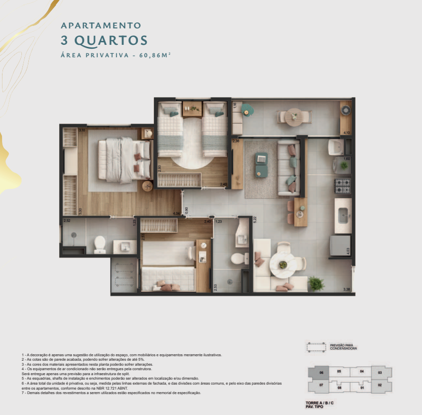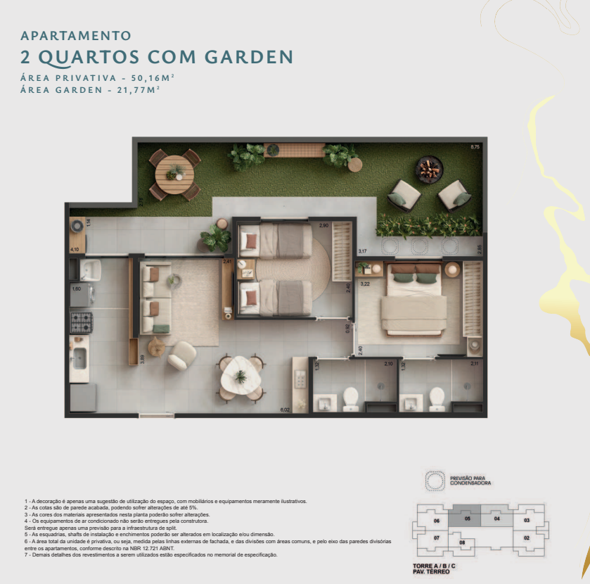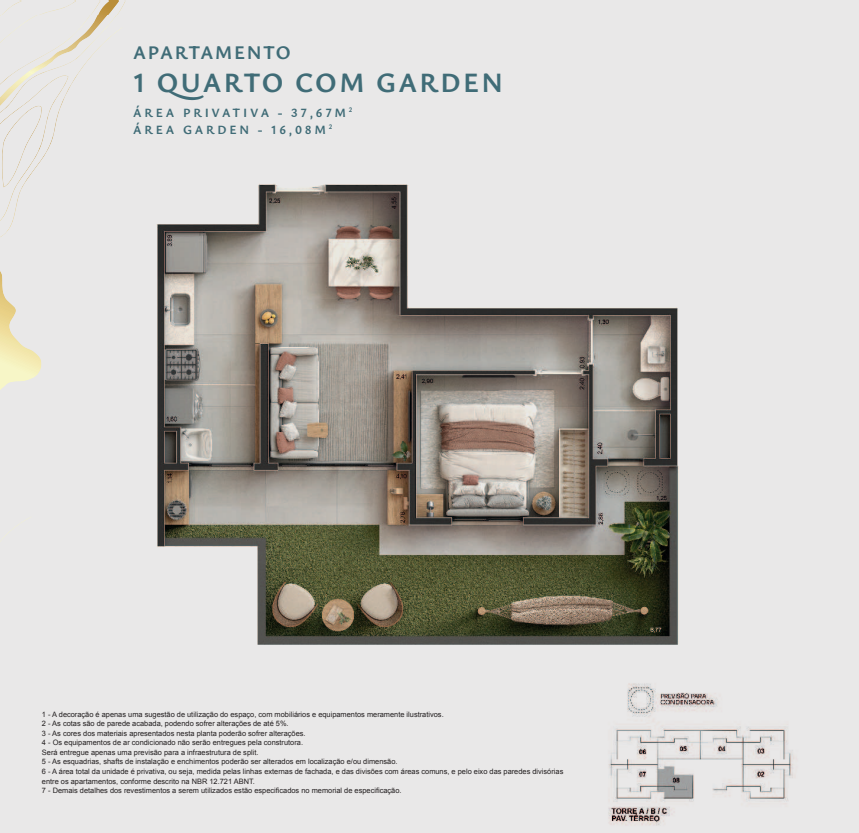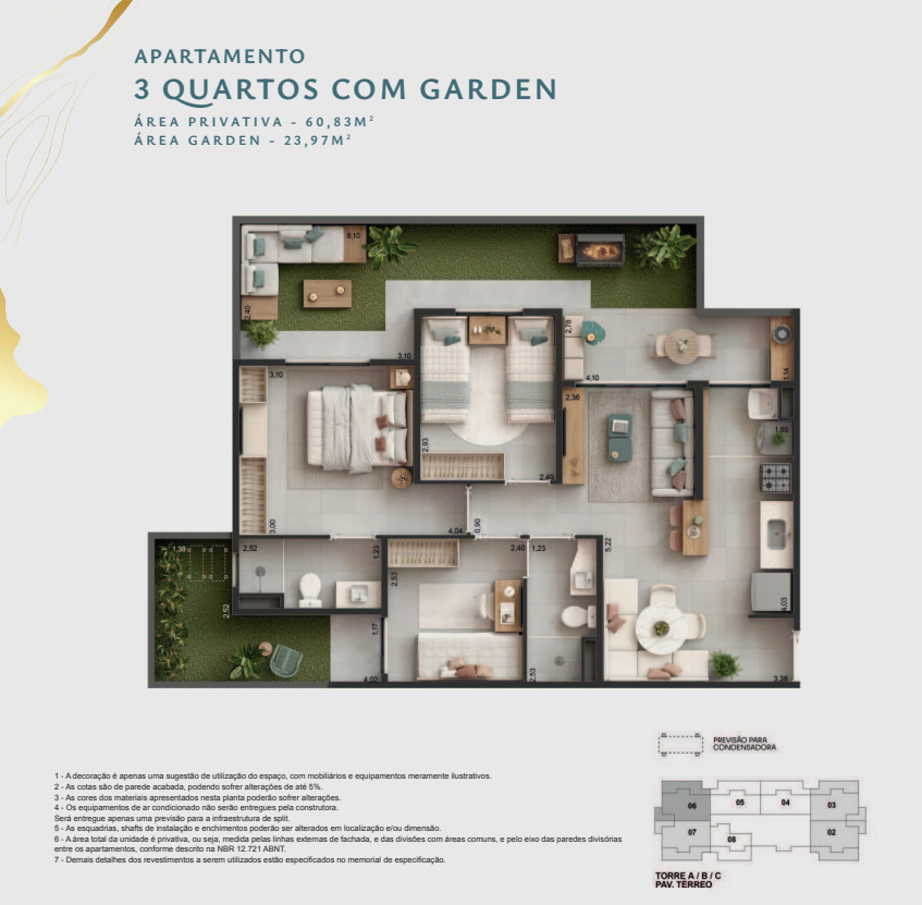 ✔️ Apartamentos de 1, 2 ou 3 quartos, com opção de garden, suíte e varanda gourmet com ponto de água e esgoto.